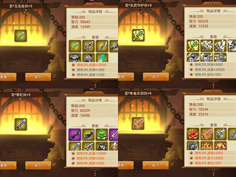 朱雀套装提供速度、智力与暴击加成,在无法凑齐整套智力阵容时,先使用朱雀剑与印即可。羽毛获取困难,集齐全套耗时过长。