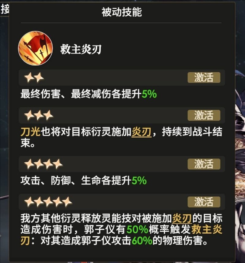 他的大招拥有240%的伤害系数,但若敌方单位携带炎刃,我方队友在释放技能攻击带有炎刃buff的目标时,郭子仪会进行反击,造成相当于自身攻击力60%的伤害。满星红五情况下,这基本等同于一次普通攻击的输出,可以这样理解。