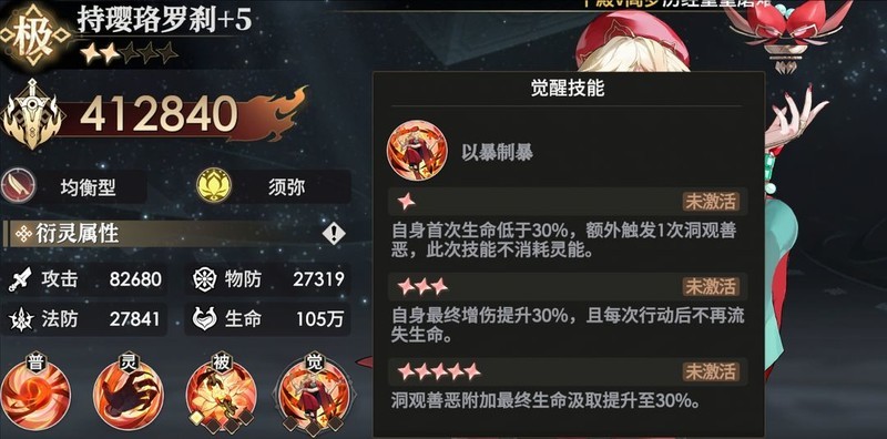 如果是同属性单挑的话,估计只有郭子仪有机会击败他,因为郭子仪能持续叠加伤害,其他角色恐怕难以将其击杀。罗刹不仅输出高,反击一个大招就能让你血量见底,还能回满自身血量,这让人十分头疼,最后我们只能把他安排在后排。