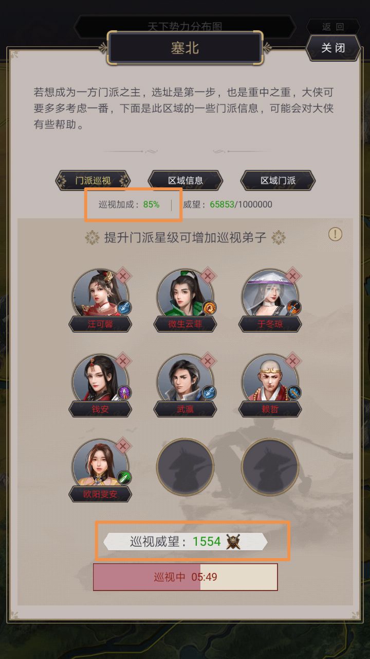 巡逻加成受所在区域、已击败的固有门派数量及是否成为地区霸主影响。每击败一个N星固有门派,巡逻加成提升(N-1)×5%,其中八星门派为特例,直接增加50%。例如,击败一个二星门派,加成提升5%;击败一个四星门派,则提升15%。若击败一个三星和两个四星门派,总加成为10%+15%×2=40%。此规则仅适用于少林、武当等原生门派,玩家建立的势力不计入统计。