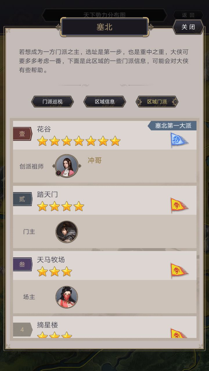 当你能够击败四星固定门派后,就迎来了新的发展契机。以我个人经验为例,大约在开派不到一个月时便具备了这一实力。此时可考虑更具优势的选址,例如荊楚或南海,这两个地区可获得40%的巡逻加成。同时建议关注塞北地区:若该地尚无其他玩家占据,且你能击败当地的四星门派,则不仅能获得35%的基础加成,还能因成为区域唯一势力而赢得区域霸主称号,额外再提升50%,合计高达85%的巡逻收益。若已有其他玩家进驻,则需通过门派比武评估自身实力,判断是否能战胜对方或确保本门派在该地保持排名第一的地位,从而决定是否迁派或继续争夺。