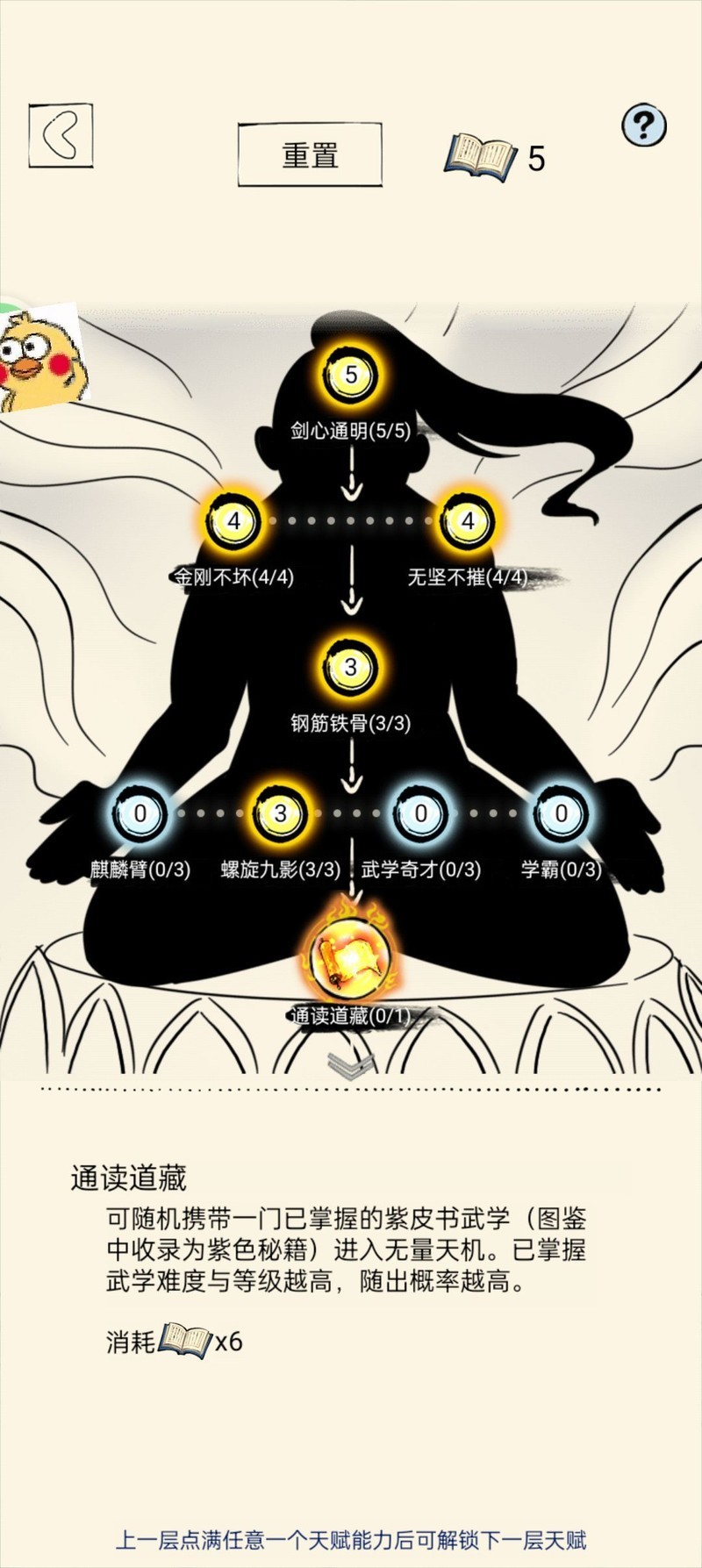 天赋树中有一个的选项必须点亮,这样可以携带一本已拥有的紫色武学书籍,效果随机触发。