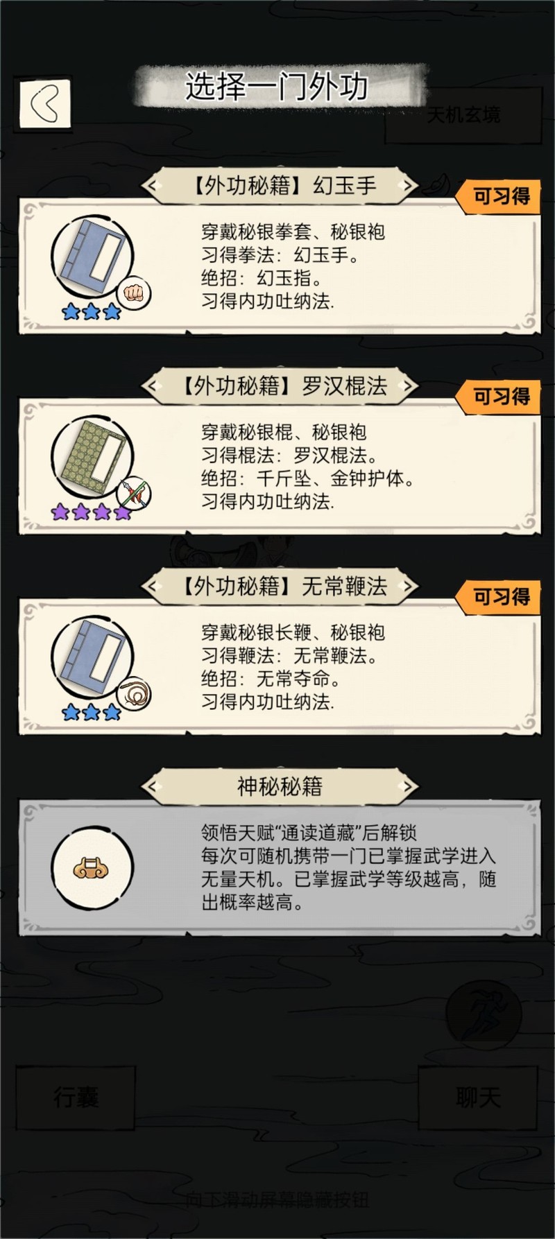 很多玩家在挑战无量天机时存在一个误区,认为开局应优先选择臂力或身法属性,其实关键在于开局武学的选择。正确做法是先从三门武学中做出抉择,再决定角色身份。虽然我推荐的武学开局体验较为艰难,但经过验证,这确实是一条可行之路,尽管过程曲折艰难,仍能助你从山脚攀登至山顶。