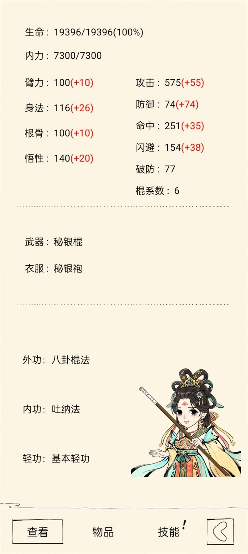 根据所选武学选择对应身份,例如我这次选了罗汉棍,因其有臂力加成,因此可搭配六扇门捕快身份。最终成型流派可走如意棍法、罗汉领悟、霸刀等臂力武学路线,过程中获取的宝物也应优先选择增加臂力攻击的类型。
