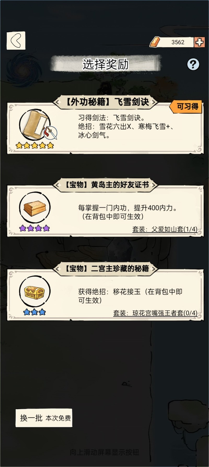 这次运气不错,抽中了,又能选一件宝物。优先考虑能组成套装或与当前流派相关的宝物,当然像这样的通用强力绝招也是不错的选择。