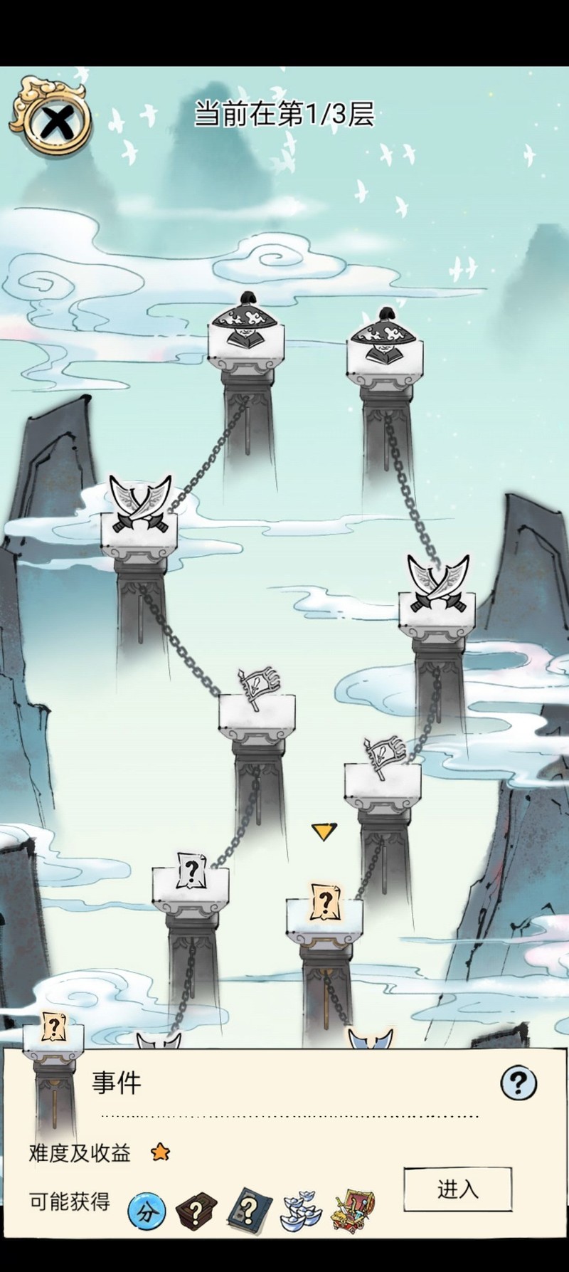 首先,你需要查看当前层的所有柱子,被铁链连接的柱子表示可以前往。提前规划好行动路线,并在战斗中不断调整优化。根据自身需求选择合适的路线,点击柱子可查看难度与收益,收益内容即为可能获得的奖励。