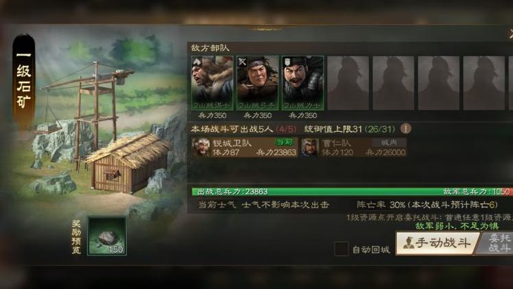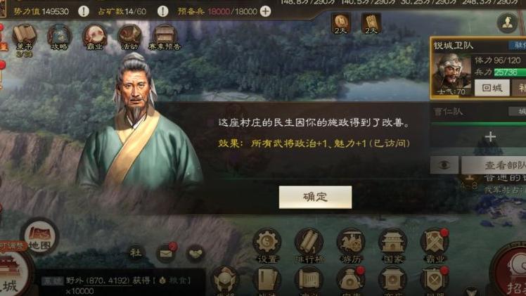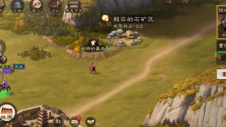 地图上分布着多处资源点,越靠近中心区域,矿区等级越高,产出越丰富。击败山贼可占领矿区,派遣武将屯田还能进一步提升收益。