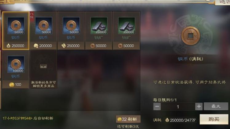 集市通过探听民需解锁商店格位,可用铜币与资源相互兑换,是获取资源的重要途径之一,建筑升级所需资源也主要由此获得。