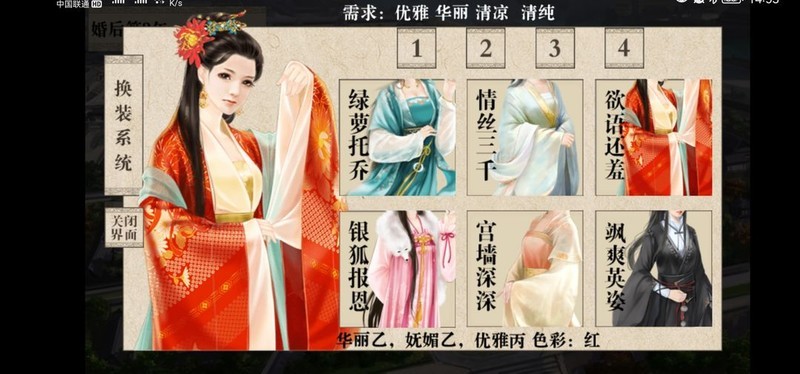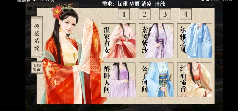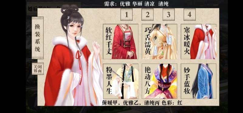 第三年正月存档,选定目标后刷好感以赠送衣物。金玉阁购三套,母亲赠一套,其余通过提升好感获得。