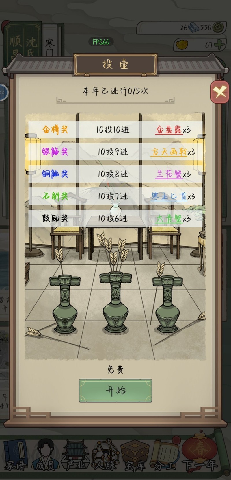 家族势力达到10后开启投壶功能。每年免费参与一次即可,无需花费大量元宝,毕竟连续五次都未命中的概率较高。