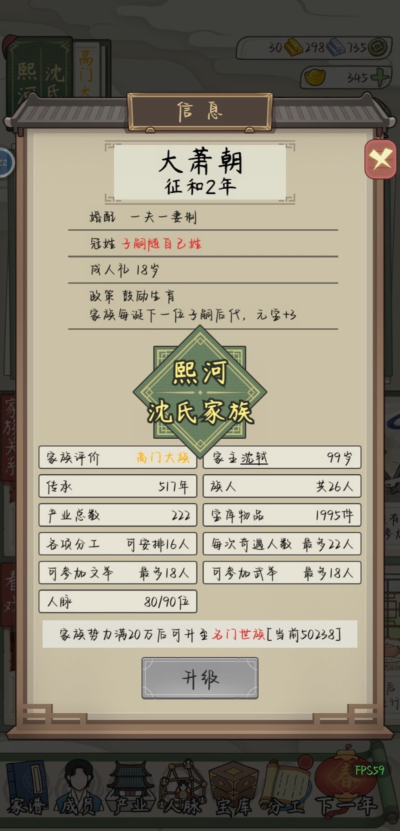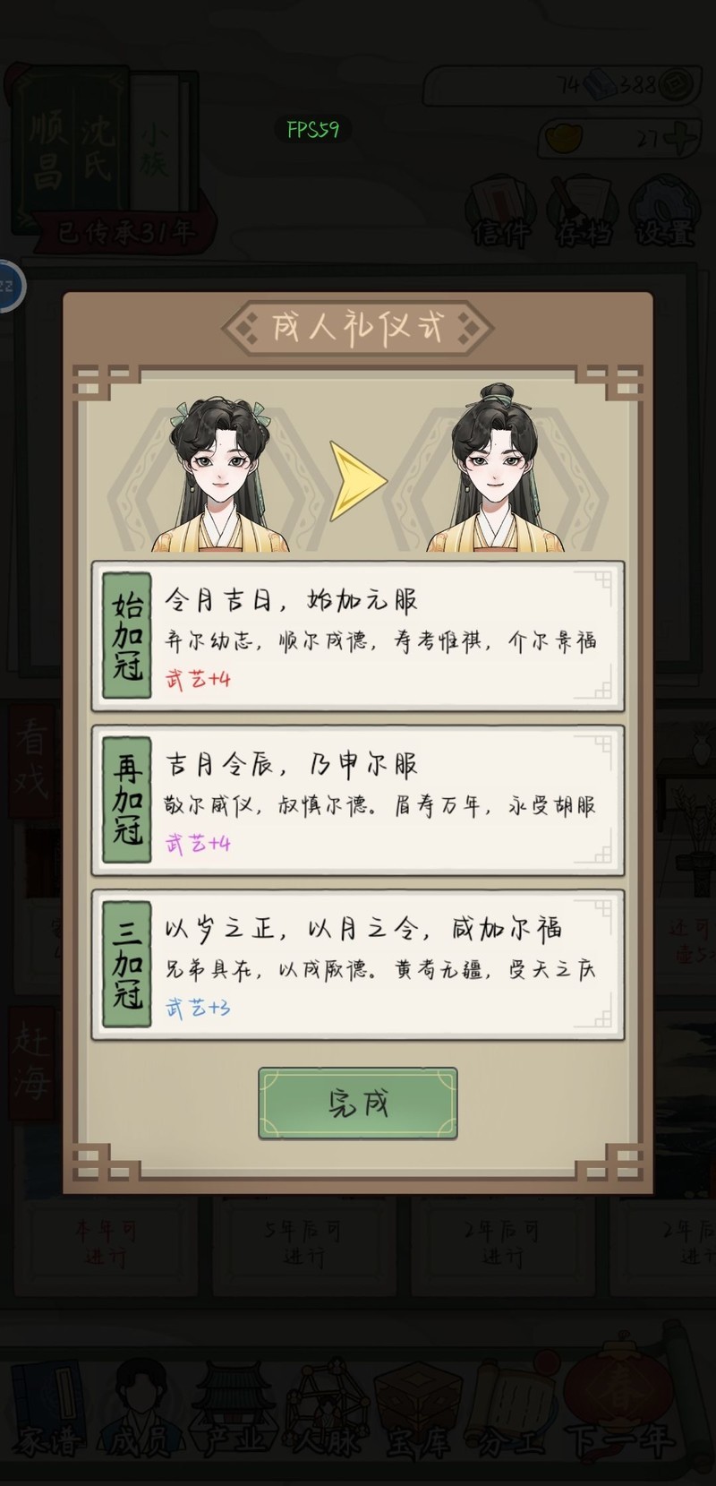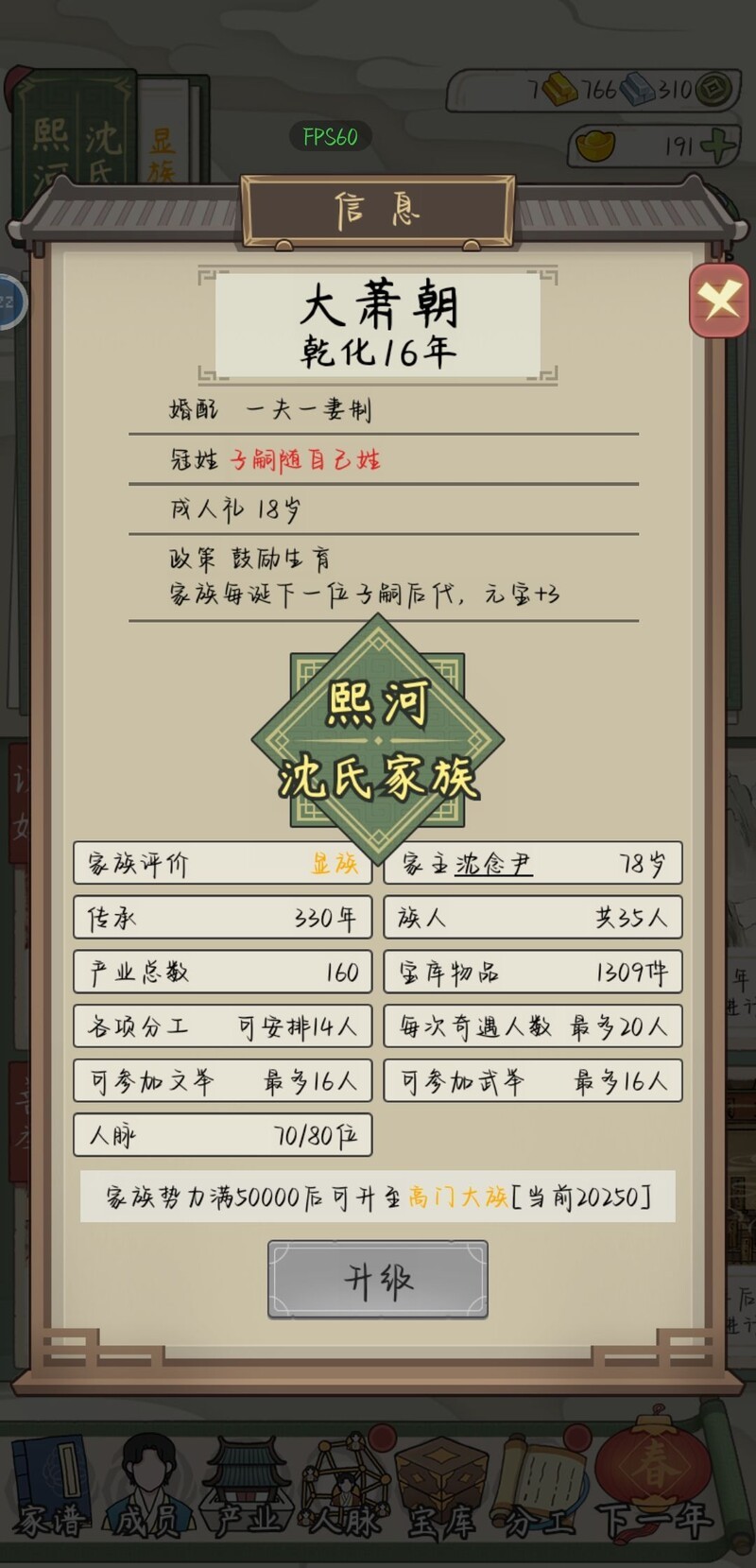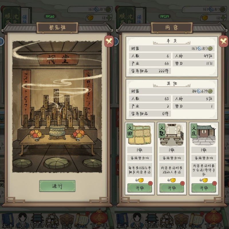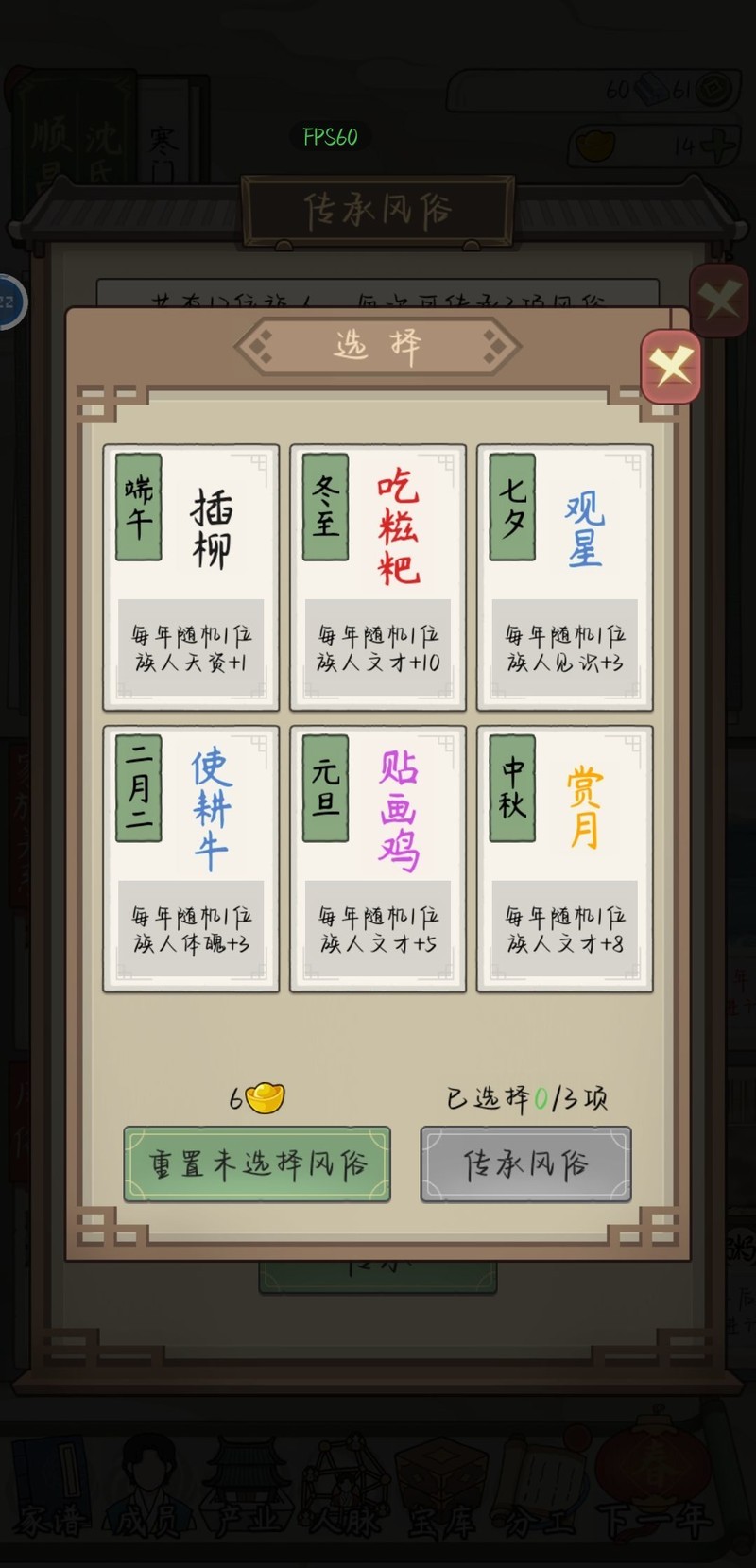 家族势力达到150后开启风俗系统,随机族人获得属性提升。