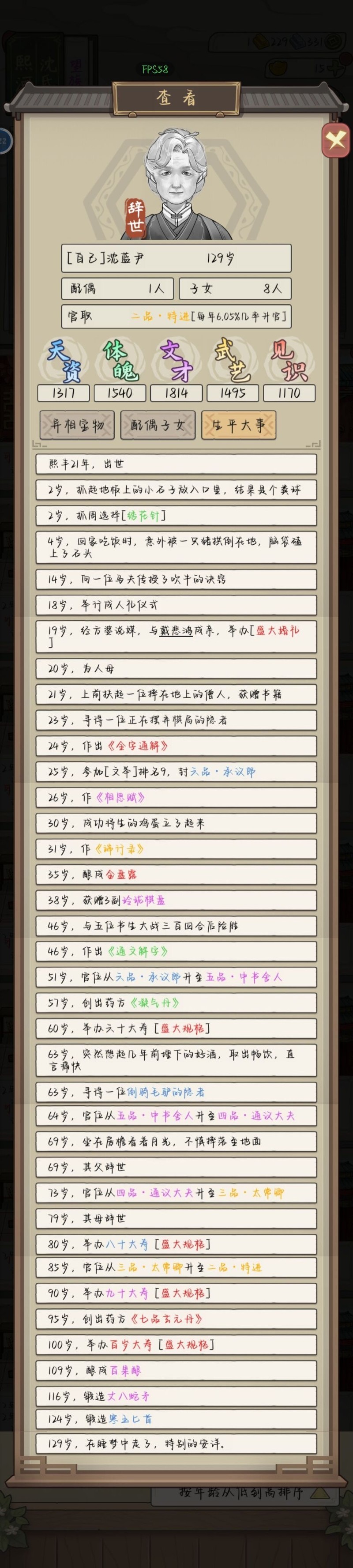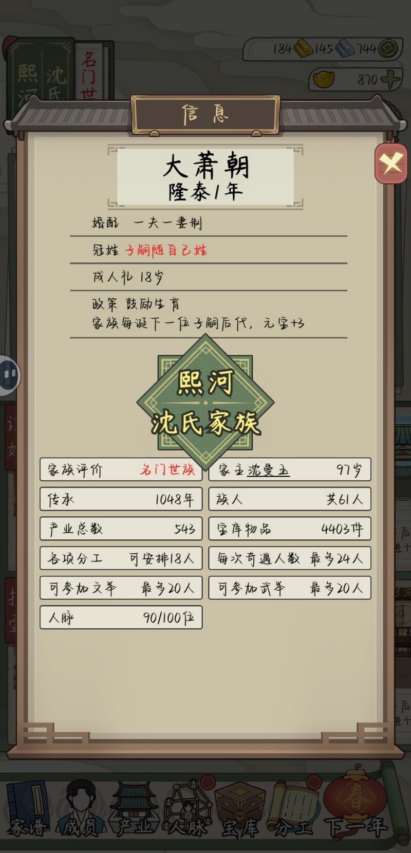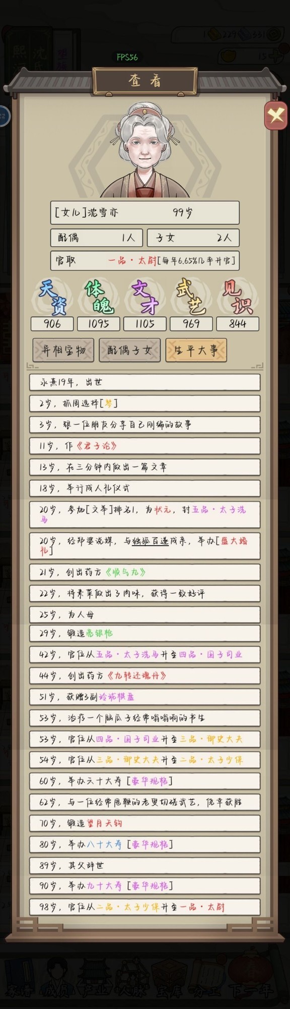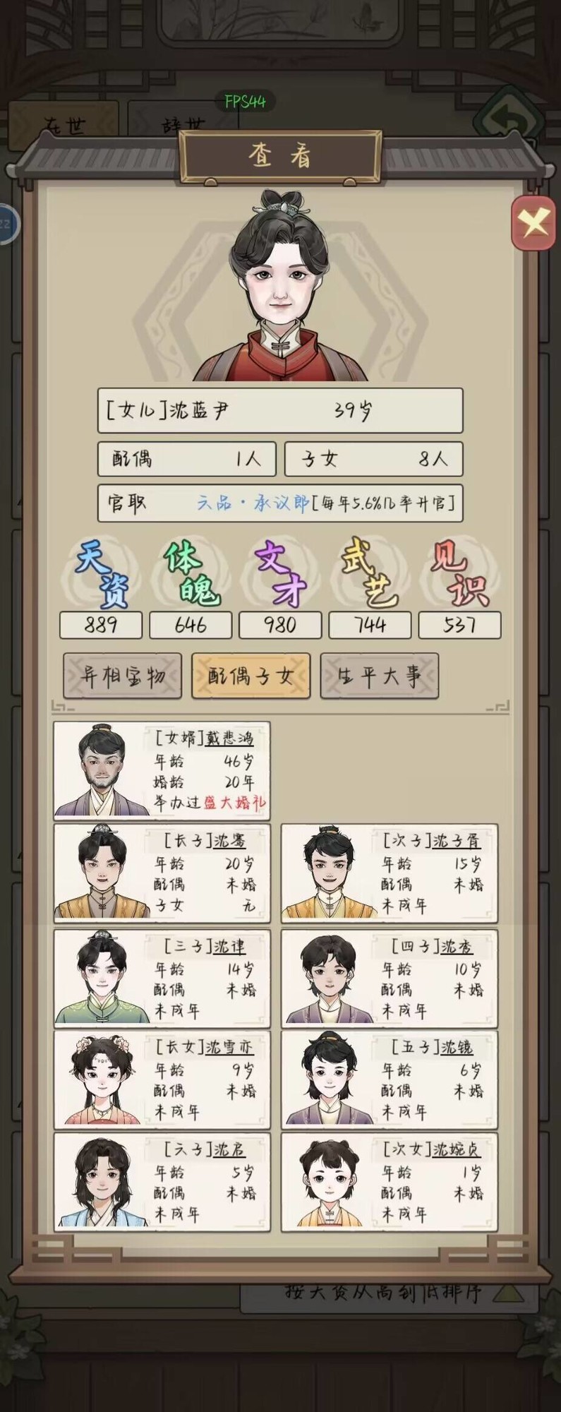 距离显族仅差数百势力,209年沈蓝尹突然离世,无奈之下只能选择长子继承家业。原本更倾向长女或次女,但始终刷不出来,选继承人实在太费元宝。后代资质普遍不佳,能力大不如前,实在无人可选,只能作罢。