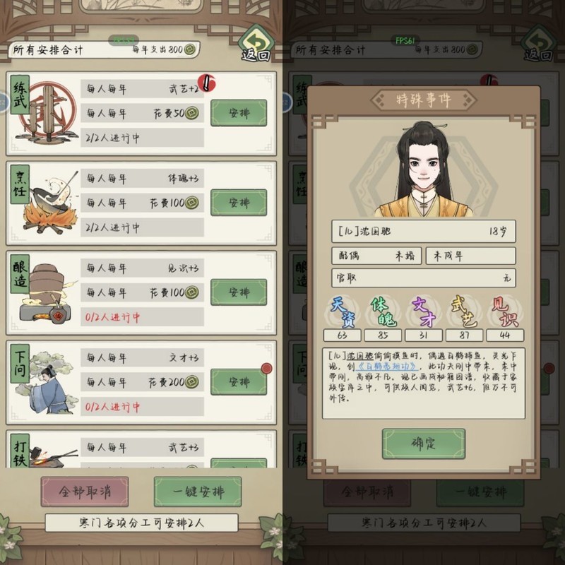 无论选择男性或女性角色,子女均随自己姓氏。初始人物属性建议选择中庸路线,天赋设定在60至70之间较为合适。