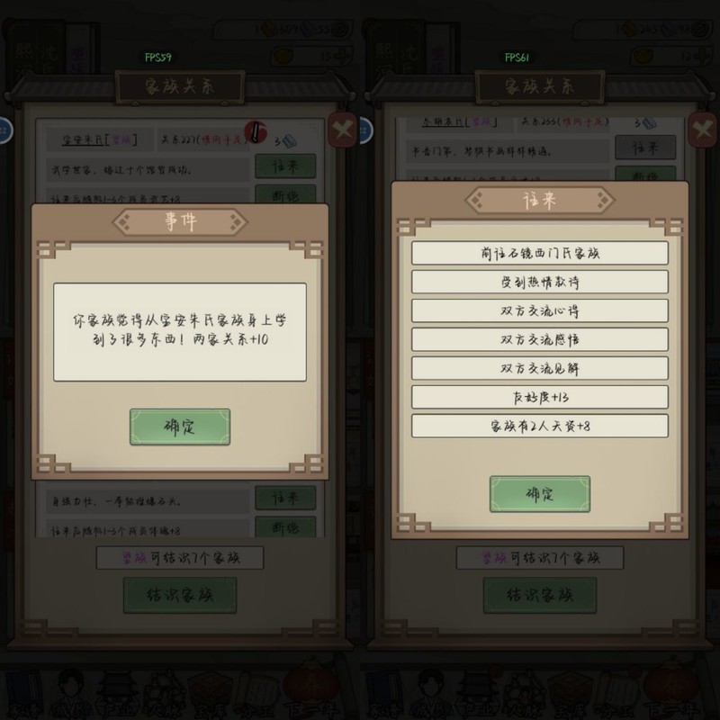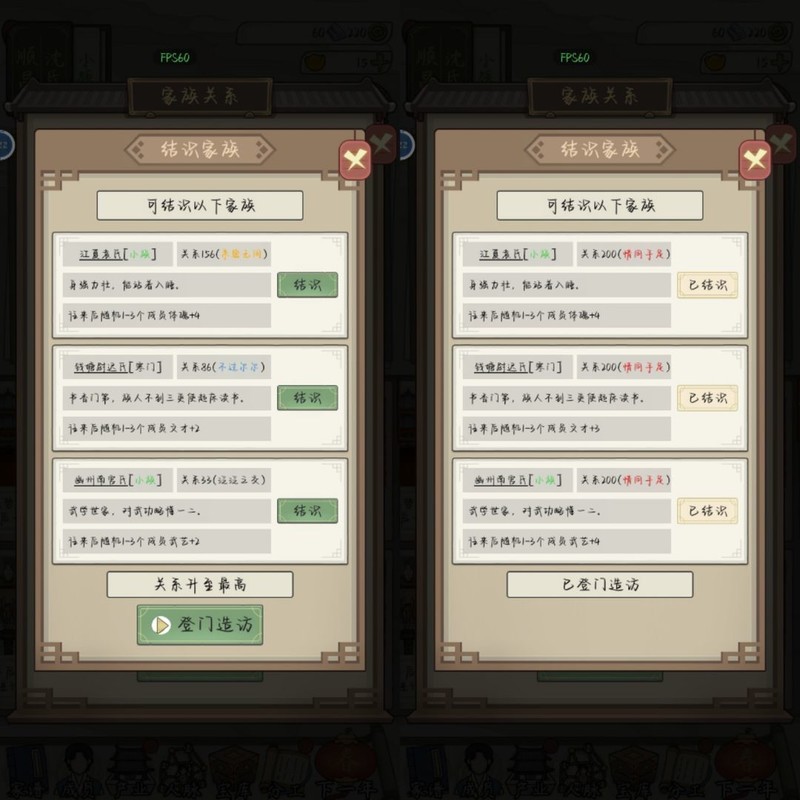 家族势力达到300后开启家族关系功能,期间可能随机触发事件影响关系变化,待条件满足后再进行相关操作。