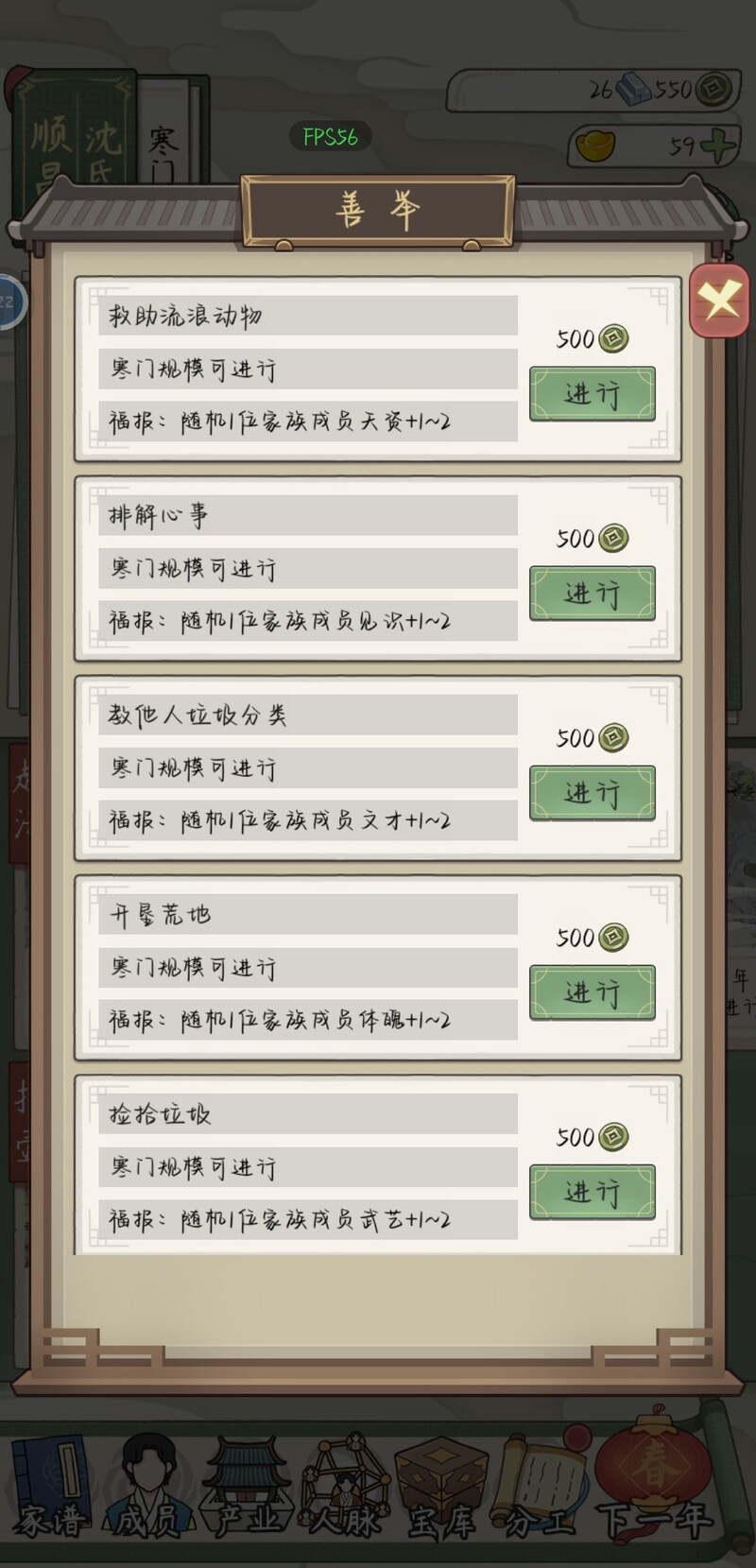 行善积德,随机提升家族成员属性,每五次必有一次成功。