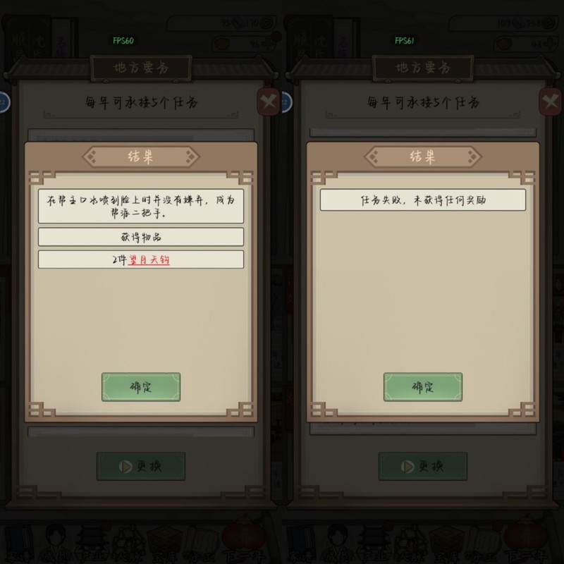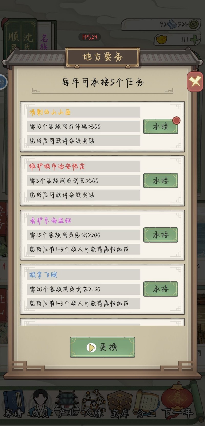 家族势力达到3000后开启要务功能,红点提示可接任务,任务有成功几率,也可能失败。