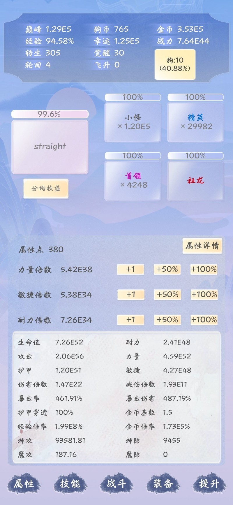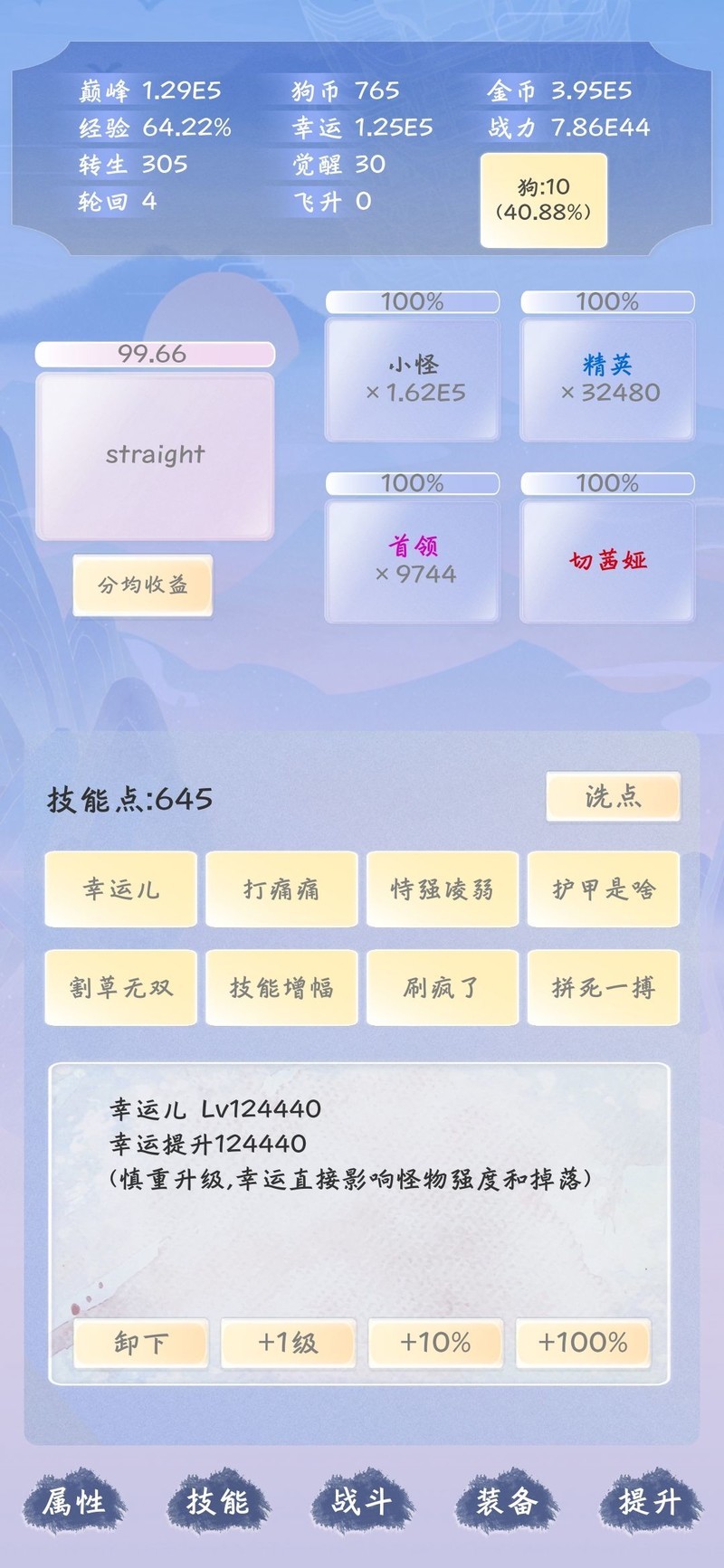 角色觉醒前优先提升力量属性,转生时随机强化一项能力,待刷出转生杀敌力量加成后可逐步提升游戏难度。觉醒后,转生将全面增强各项等级,标志着正式进入游戏核心阶段。觉醒与转生等级比例为1:10,即觉醒前需达到转生等级的十倍经验值。