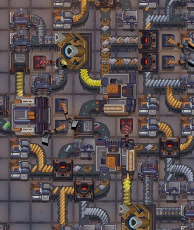 工厂分为三级,矿场设二级,当两矿共用传送带时,一级矿优先输送。红色机械臂可替换为黄色。上部初级工厂制造钢板、绝缘线与电池,下部生产磁铁、硫酸及绝缘线。绿瓶产能最大化,副产蓝瓶。单元内资源富余,可外接石墨生产并输出硫磺。