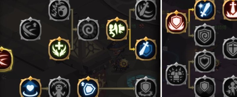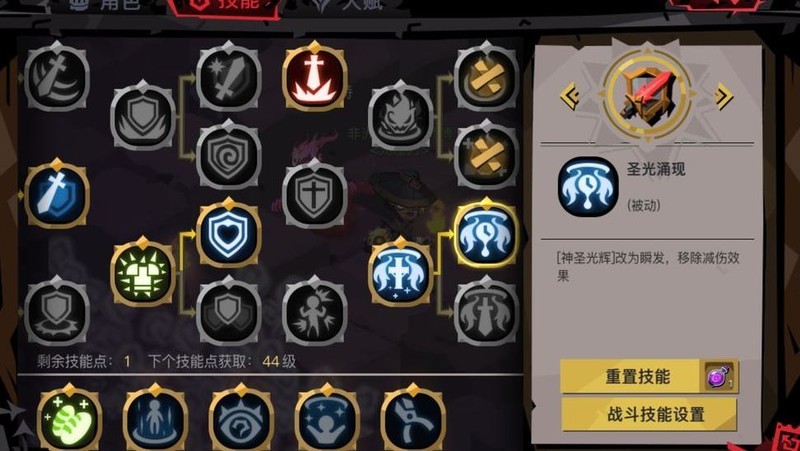 首先用现有技能点清理小怪并回满蓝量,随后站在守门员面前重置技能。调整时将雷霆替换为固守即可,由于此次洗点仅针对守门员战斗,无需投入吞噬与法力汲取,应优先点亮神圣光辉与圣光涌现。当固守效果结束且处于技能冷却阶段时,格挡率会回到基础水平,此时使用神圣光辉可有效维持血量稳定。同时保留驱散恶意技能,以应对可能出现的流失类词条影响,确保战斗中的持续生存能力。