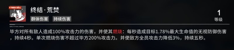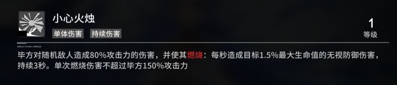 LV3技能伤害提升至攻击力的135%,优先攻击生命值较高的目标,燃烧效果每秒造成最大生命值3%的伤害,单次燃烧上限为毕方自身攻击力的200%,持续5秒,心智等级达到6级后解锁。