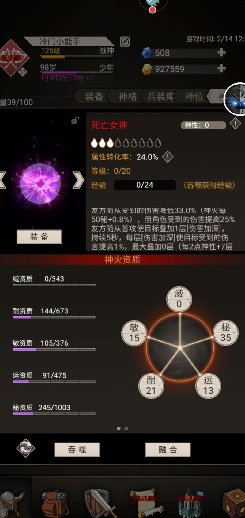 死亡女神天赋减伤,神力加成提升攻击输出。