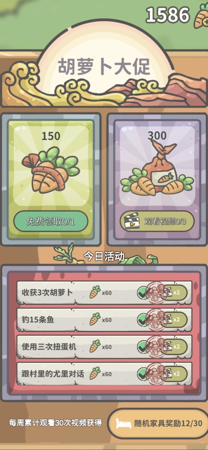 右上角萝卜加图标的大促活动,每日最多可得1530个萝卜,下方今日活动有时会刷新扭蛋券。