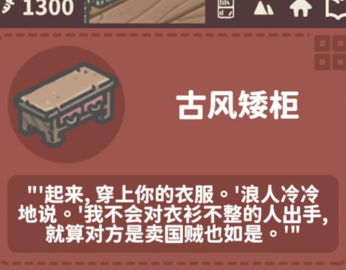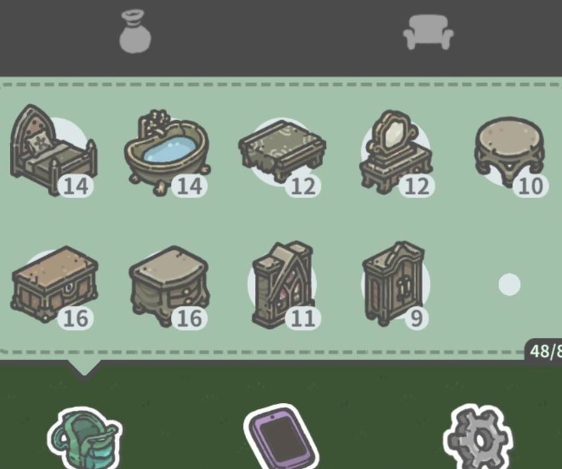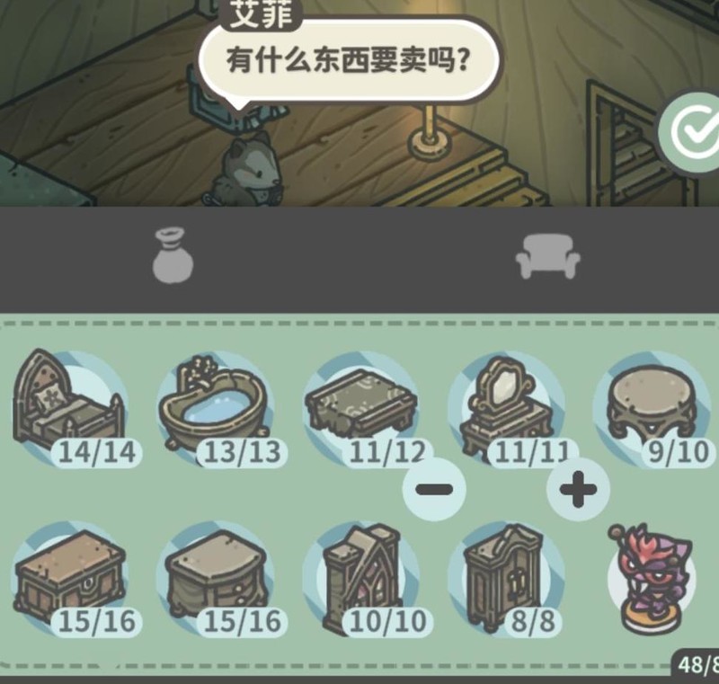 我等了好久才把一堆家具收进背包,每种只留一件,其余全卖掉了。