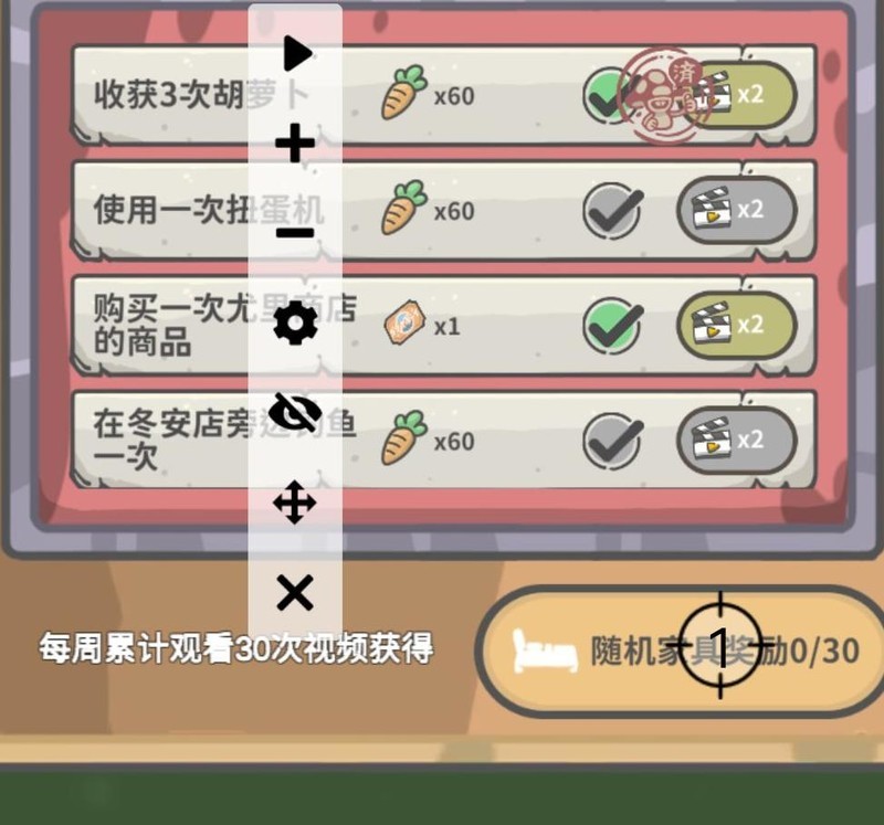 同一周内观看满30个广告后,用连点器点击随机家具奖励即可获取。具体连点器使用方法详见评论区说明。