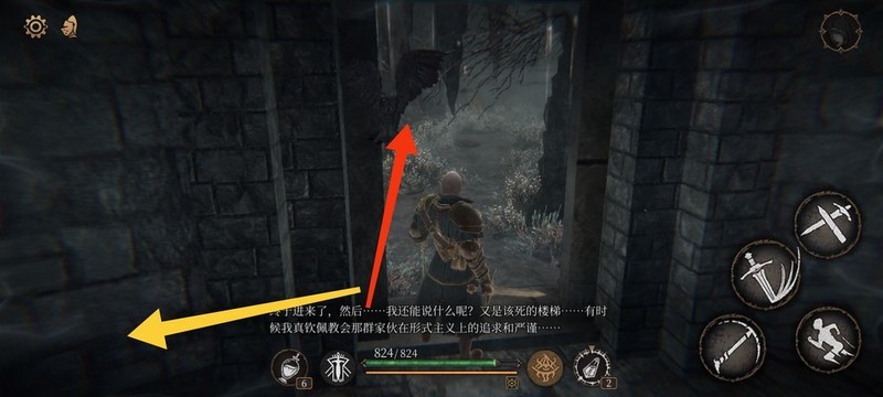下旋转楼梯,沿黄标前往赫吉(理智)与文献(狱卒日记),再循红标抵达祭坛。