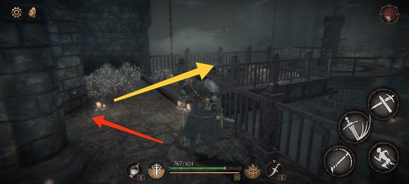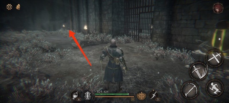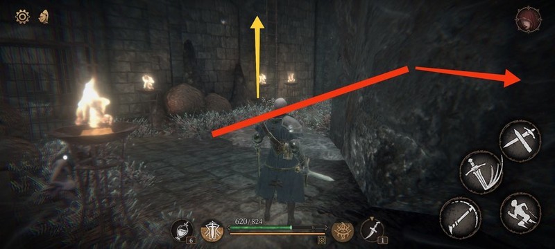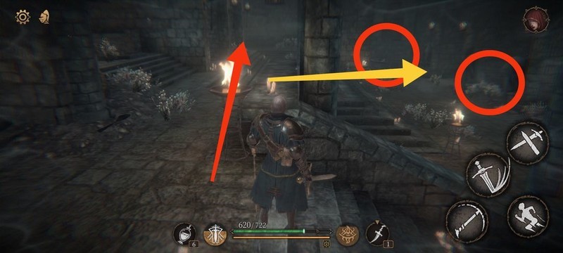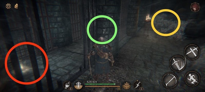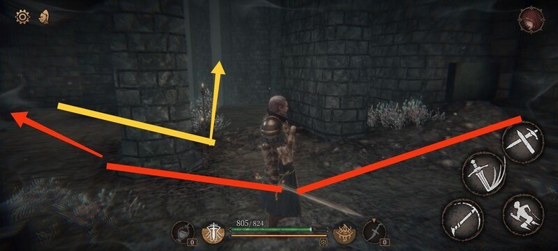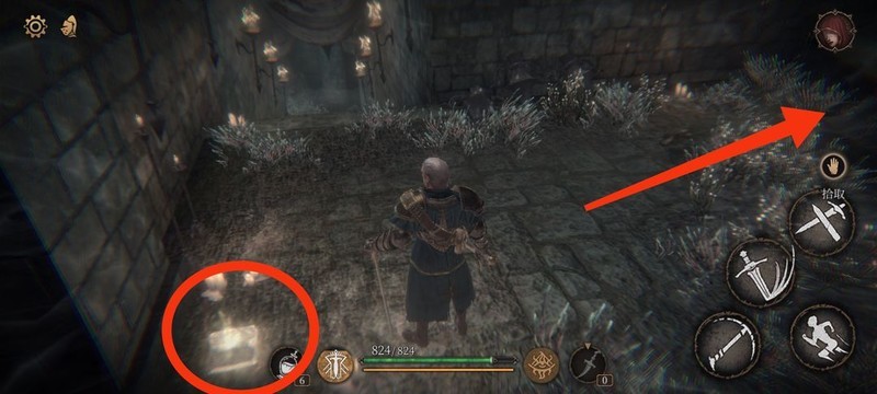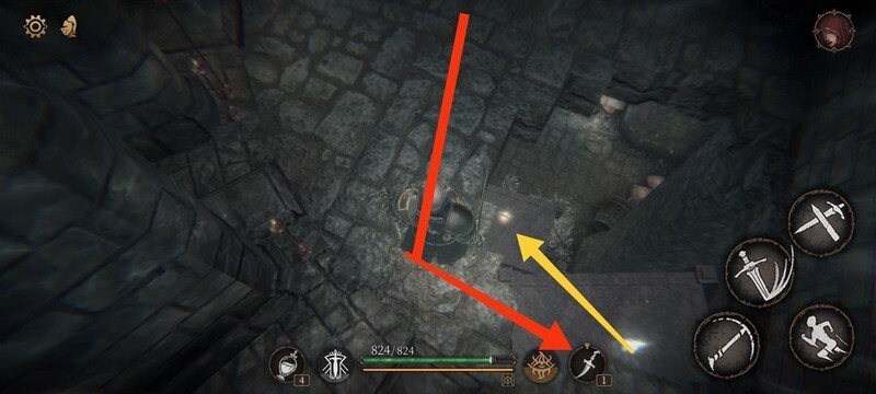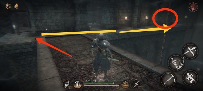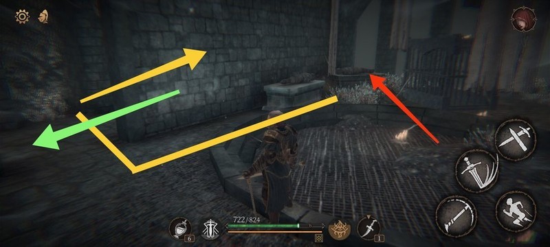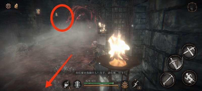 红圈处拾取物品,黄圈为梯子,沿红标前行击败火炬男后进入牢房。