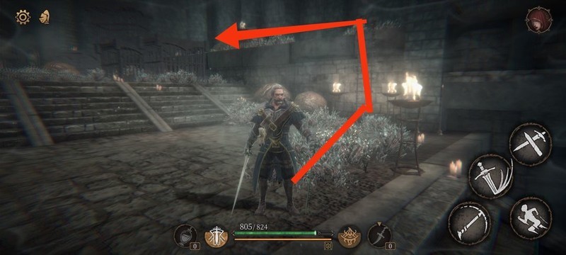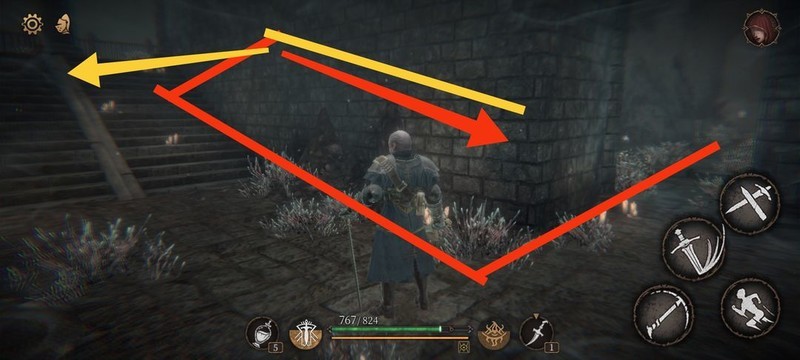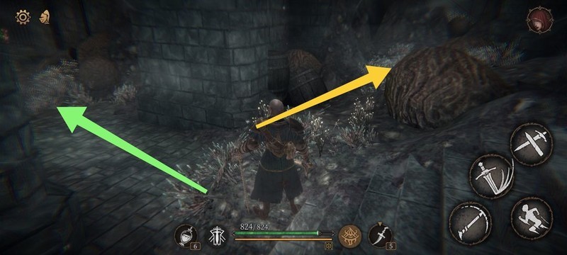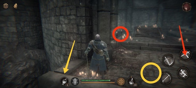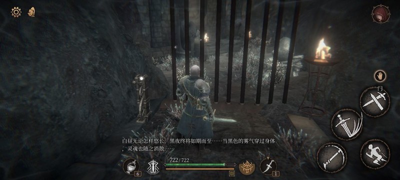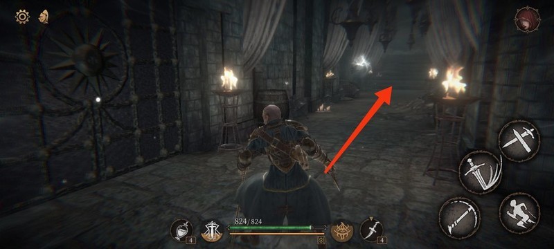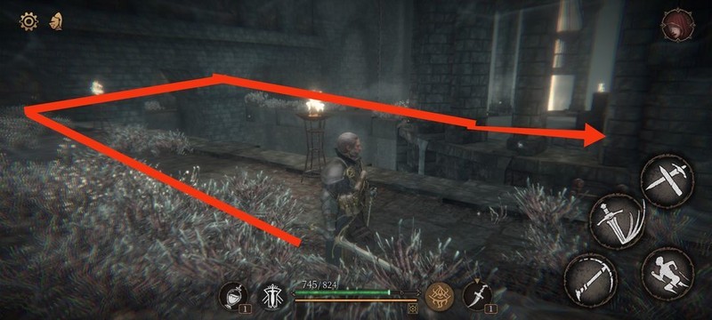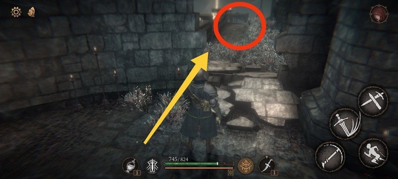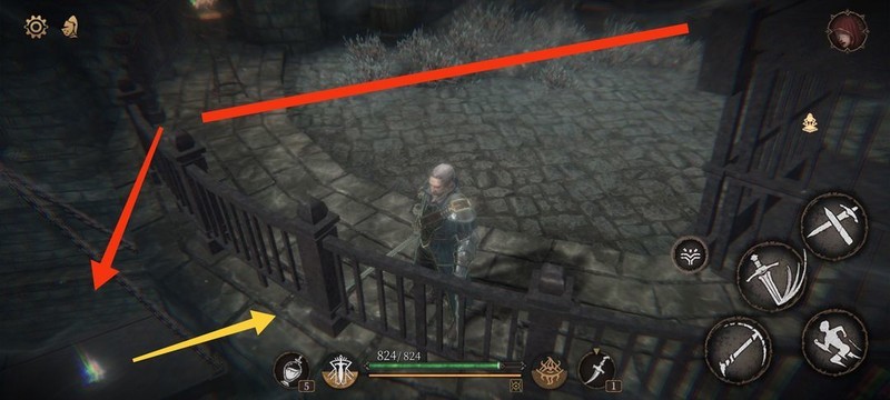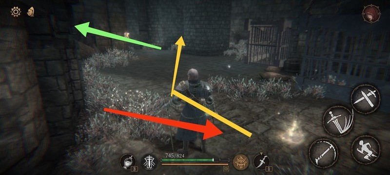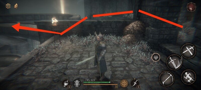 红圈处拾取物品,黄圈为梯子,沿红标前行击败火炬男后进入牢房。