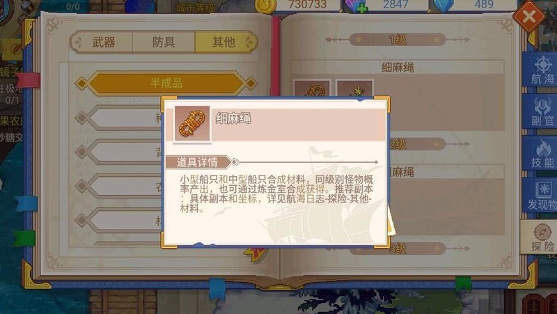 许多人询问如何获得绳子,方法在此说明。虽略显循环,但需在船舱内自行制作,使用同等级的织物类植物材料。同理,其他半成品也需相应原料,而织物及部分烹饪材料可于下方栏目中获取。