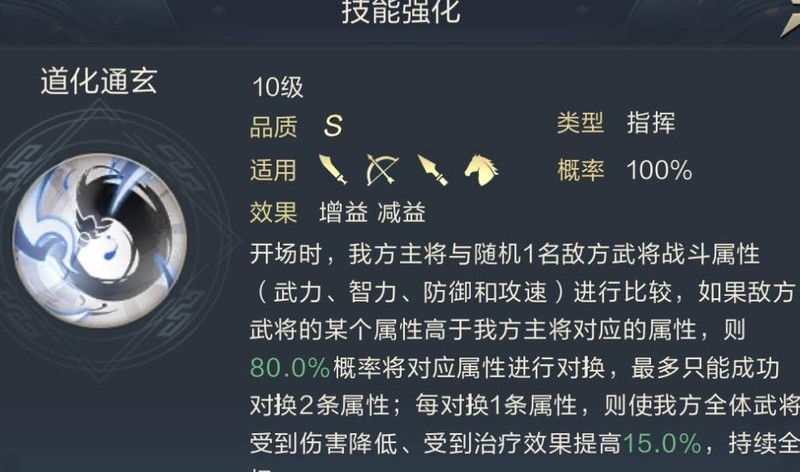 实战收益虽需较低属性才能触发交换,但由于武将与智将属性差异明显,即便副将成长普通,其部分属性仍常高于异类型主将,因此道化通玄在战斗中几乎不会出现完全无法触发的情况。