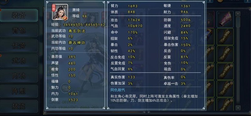 副剑需承担伤害并挂减防效果,必须保证生存能力,因此血量要高且具备回血能力。我的副剑防御仅5000多,需适当堆叠韧性,避免被暴击频繁压制导致回血不足,通过持续消耗逐步取胜。