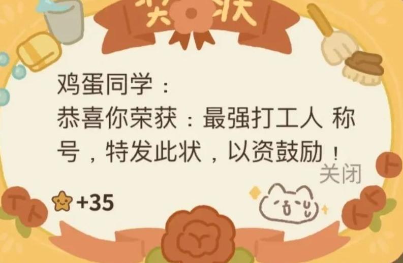 鸡蛋的荣誉证书:三朵四级小雏菊(概率56.89%),或四级蓝风铃搭配铜水壶与三级小雏菊(概率56.12%),亦或一级小雏菊、一级蓝风铃加二级小雏菊(概率55.78%)。满足任一组合即可获得35颗星。证书内容为:鸡蛋同学,恭喜荣获最强打工人称号,特颁此状,以示嘉奖与鼓励!