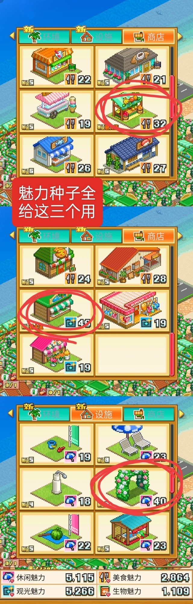 因为土特产属于观光类,拱门用于休闲,水果店归类为美食,结合这三类特性可以快速提升收益。前期要优先给这三个使用魅力种子,这样能迅速积累到10,000魅力值,为后续发展打下基础。