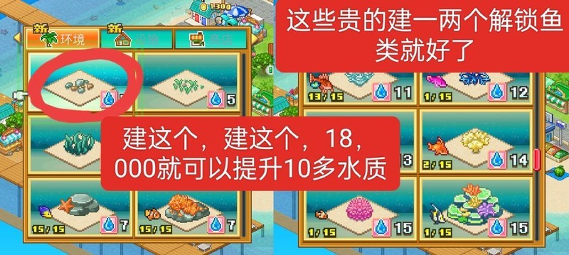 水质一定要重视!优先建造石头设施!虽然标注只有5点水质加成,但连续建造一个就能提升十多点水质,而且价格便宜,性价比非常高。预算在60000以下的可以建满十五个填满鱼类,超过的话只需建造一个来解锁鱼类即可。