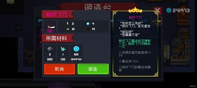 选择游侠角色,携带一技能(建议升至六星以上,具备暴击穿透效果)。先食用妙妙花,若天赋不符合要求则重开存档,反复尝试直至刷出三武器天赋。随后打造三把削你飞刀,仅需9个铁矿和3个青色魔法碎片,成本低廉。可顺带制作一根鱼竿。完成后前往花园食用其他植物以增强属性。