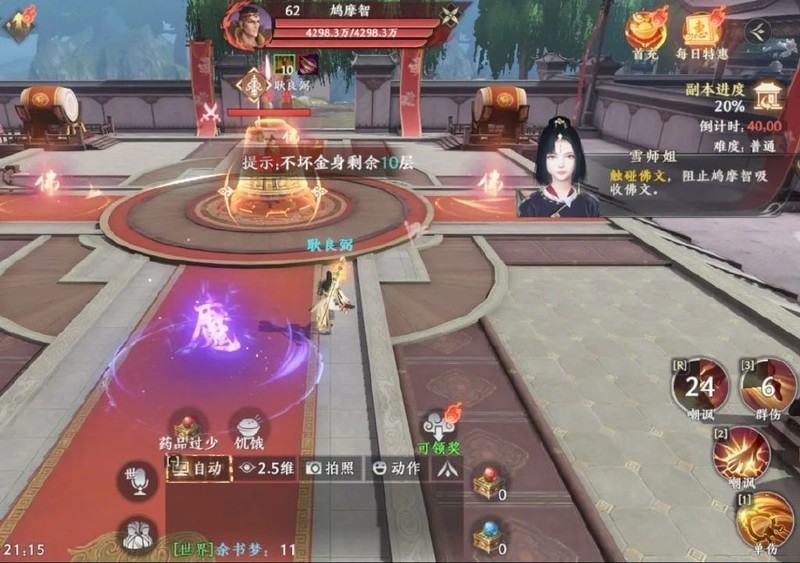 战斗开始时,鸠摩智位于场地中央的金钟罩内,四周会不断生成佛理与魔心两种符文,并向中心汇聚。玩家需根据职业特点选择拾取对应符文:坦克和治疗职业应主动拾取佛理,可减少所受普通攻击伤害并提升治疗效果;输出职业则应拾取魔心,以增强自身造成的伤害。注意规避错误符文,避免负面效果。合理分配符文获取是应对此阶段的关键策略,确保团队在承受伤害与输出效率之间达到最佳平衡,顺利推进战斗进程。