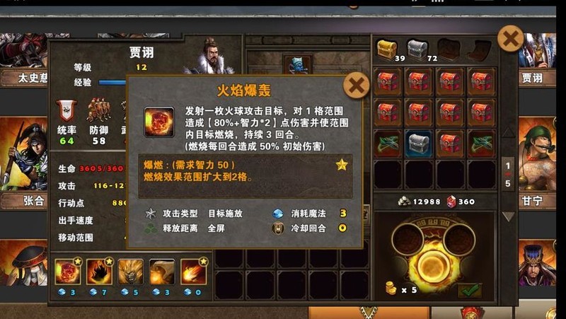 火焰爆轰造成1格范围内群体伤害,附带持续3回合的灼烧效果。直接伤害为80%攻击力加两倍智力,每回合结束时灼烧伤害为直伤的一半,影响范围2格。