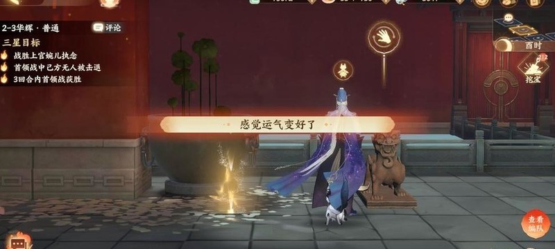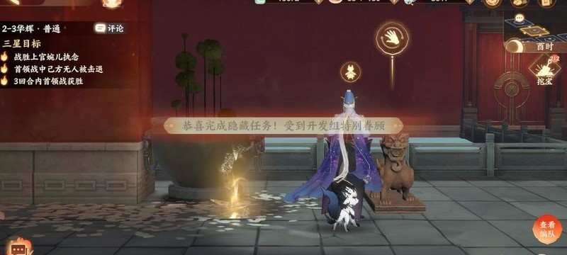 在游戏世界中,普通玩家进入2-3华辉支线地图时,门口的石狮子可交互。持续点击会触发提示:感觉运气变好了,恭喜完成隐藏任务!受到开发组的特别眷顾。