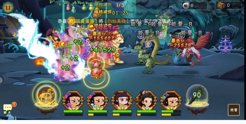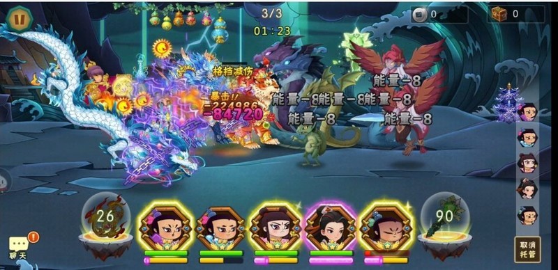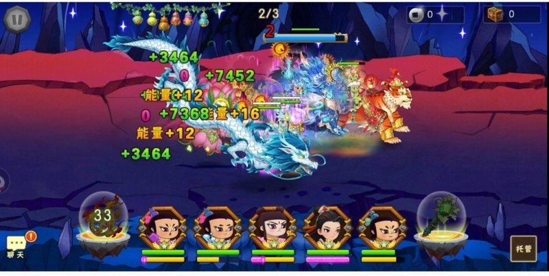 第三小关难度较高,本关共有9个敌人,包括开局时的2个鹰身人、1个河童、1个娜迦、1个凤蛇和1个多头怪。大约在58秒时,会刷新出1个河童、1个鹰人以及1个娜迦。进入关卡后会和第一关一样被敌方法宝禁锢,5秒后可使用花仙杖。本关需要释放两次花仙杖,因此不能等到禁锢结束才使用。进入战斗时,七娃和哪吒的技能已充满,蝴蝶和双能也已满格,金刚在禁锢期间技能也已充满,建议一直点击技能,确保在禁锢解除的瞬间释放技能,因为金刚此时已濒临阵亡,跳跃时有短暂无敌效果可以用来保命。当风火轮即将冷却完毕时切换为手动操作,保留七娃和蝴蝶的技能,在援军登场后,将七娃、蝴蝶和风火轮技能一同释放。后期托管推进,当花仙杖即将冷却完成时,保留七娃和蝴蝶技能,在最后十秒与花仙杖一同释放,实现极限通关。