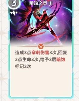 通关时若触发连击刀附魔,其余两张建议选择回归。暗蚀灵具备节能特性,若追求稳定通关,可考虑多复制一张暗月。暗月合成简便且增益强大,在不依赖迅捷之灵的前提下,仅凭刺客与连击刀的被动效果,即可叠加至30层暗蚀,获得90点冰冷与90点爆裂伤害。但因其为消耗类卡牌,建议额外复制一张以确保流程顺畅(也可采用双分策略)。亦可选用一张暗蚀灵,其机制更直观,伤害计算清晰,但输出可能略低于暗月,具体可根据史诗难度灵活调整配置。