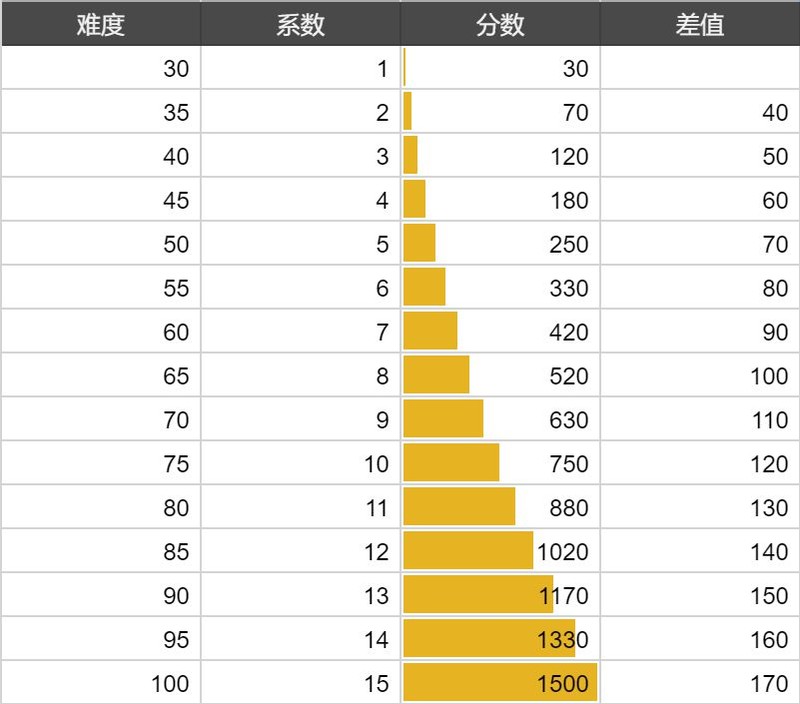 若以五级为一档,各档之间的差值为30加档位差乘以10,呈线性递增关系。