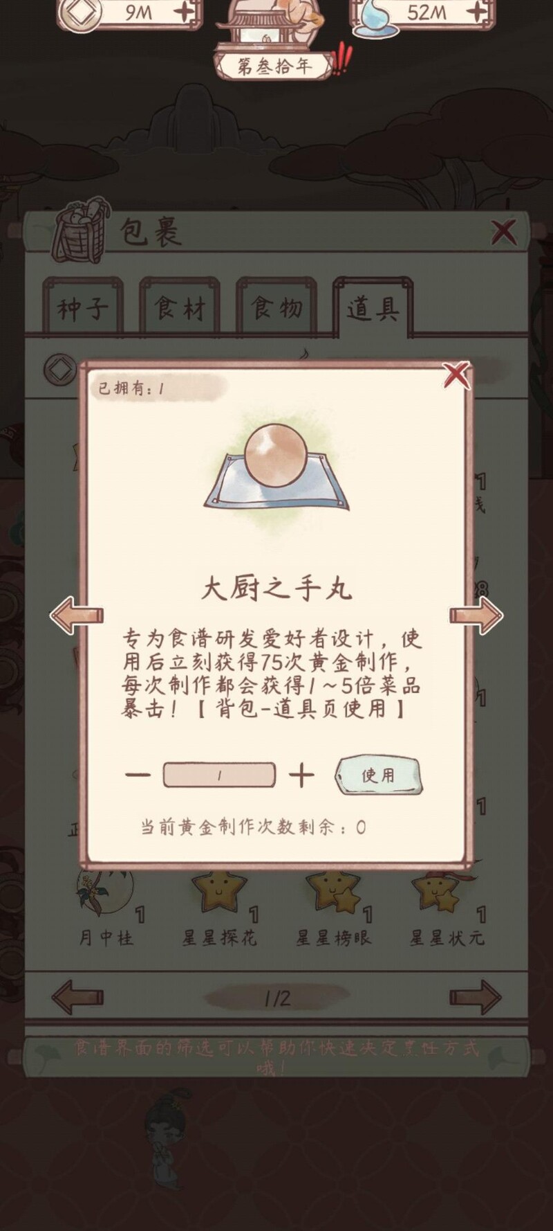 使用大厨之手丸可获得75次黄金制作机会,每次仅需一份食材即可产出1至5份菜肴,特别适合制作成本较高的菜品,如麻辣火锅,能有效提升收益与效率。