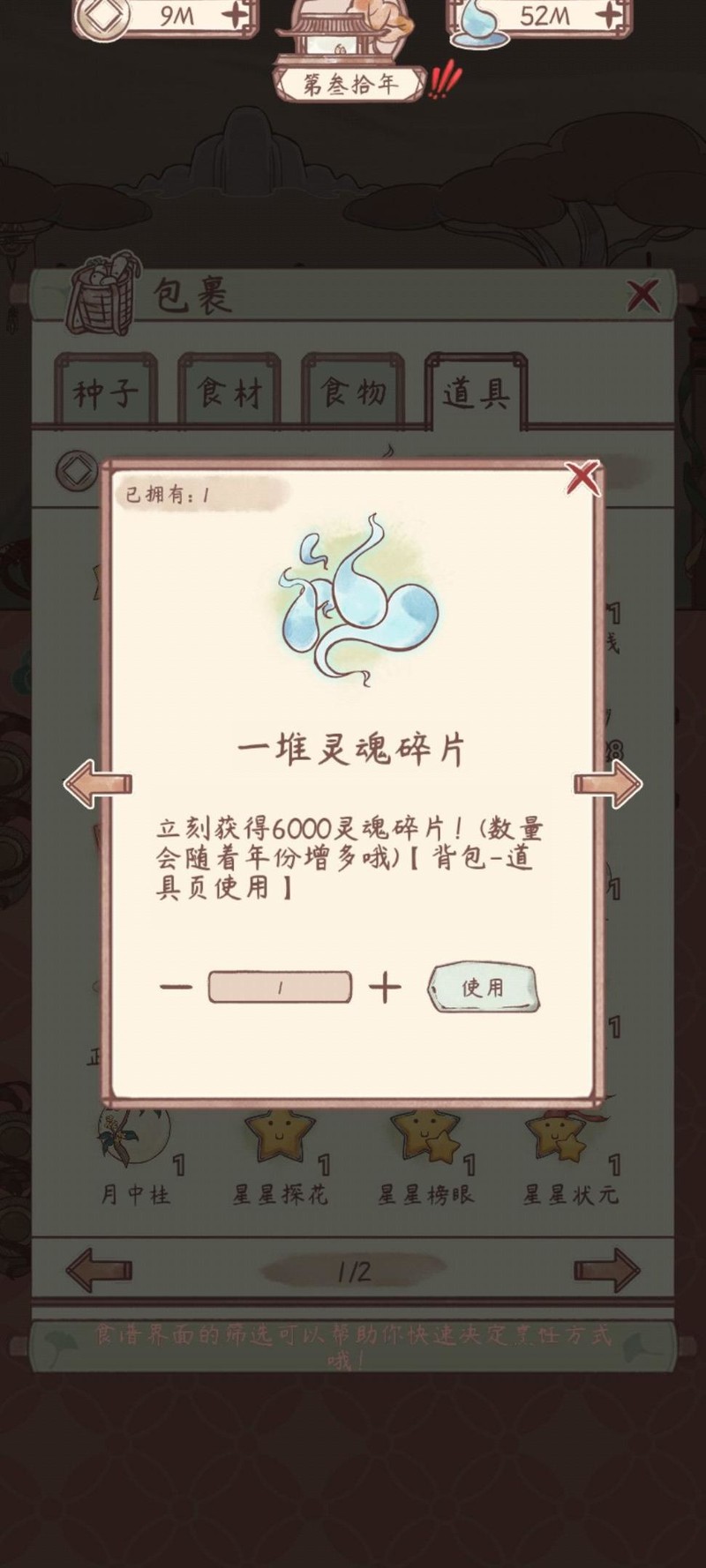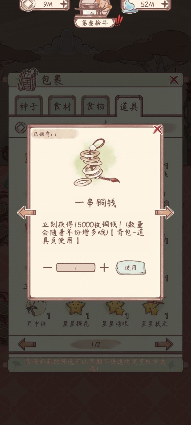 使用方法:包裹内道具使用后可获得铜钱,年份越久获取越多。建议缺钱时再兑换。每日可看广告领取三次铜钱,签到和完成日常任务也能获取奖励。