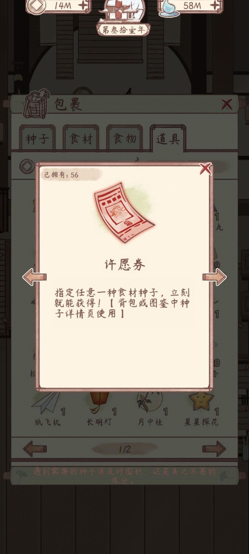 使用方法:打开包裹随机获取金票、无忧食材或种子等奖励。