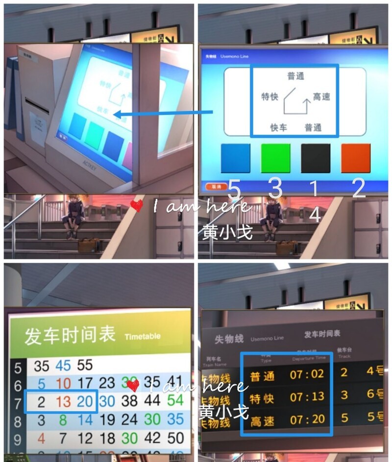 6. 在售票窗口处,按照提示顺序(普通→特快→快车→普通→高速),对照电子屏信息(普通07:02、特快07:13、高速07:20)及发车时刻表颜色线索(2:黑、13:红、20:蓝),依次按下黑、红、绿、黑、蓝按钮,其中快车对应绿色。