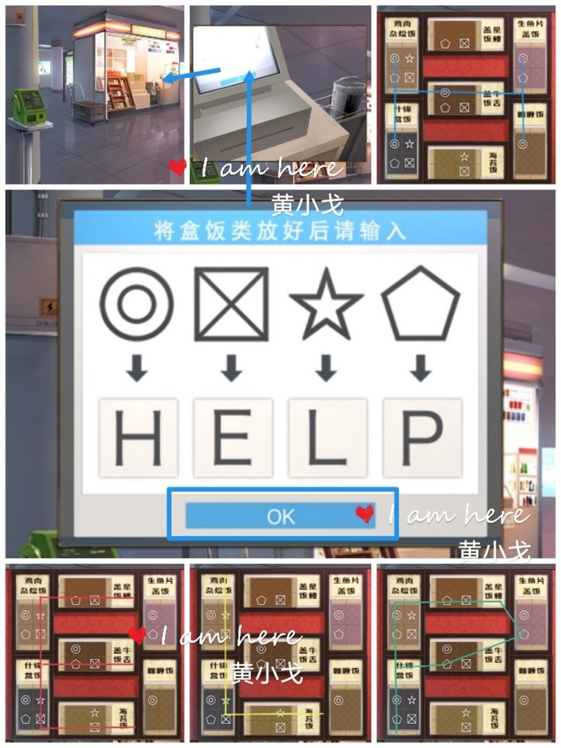 点击收银机,按照其表面图案与盒饭图案的对应位置,输入密码HELP。若某位置无对应图案,则去掉该框,会生成新的字母。