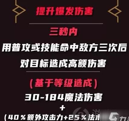 施放技能或强化普攻命中敌方英雄时,获得30点最大法力值,最高可叠加至300点。